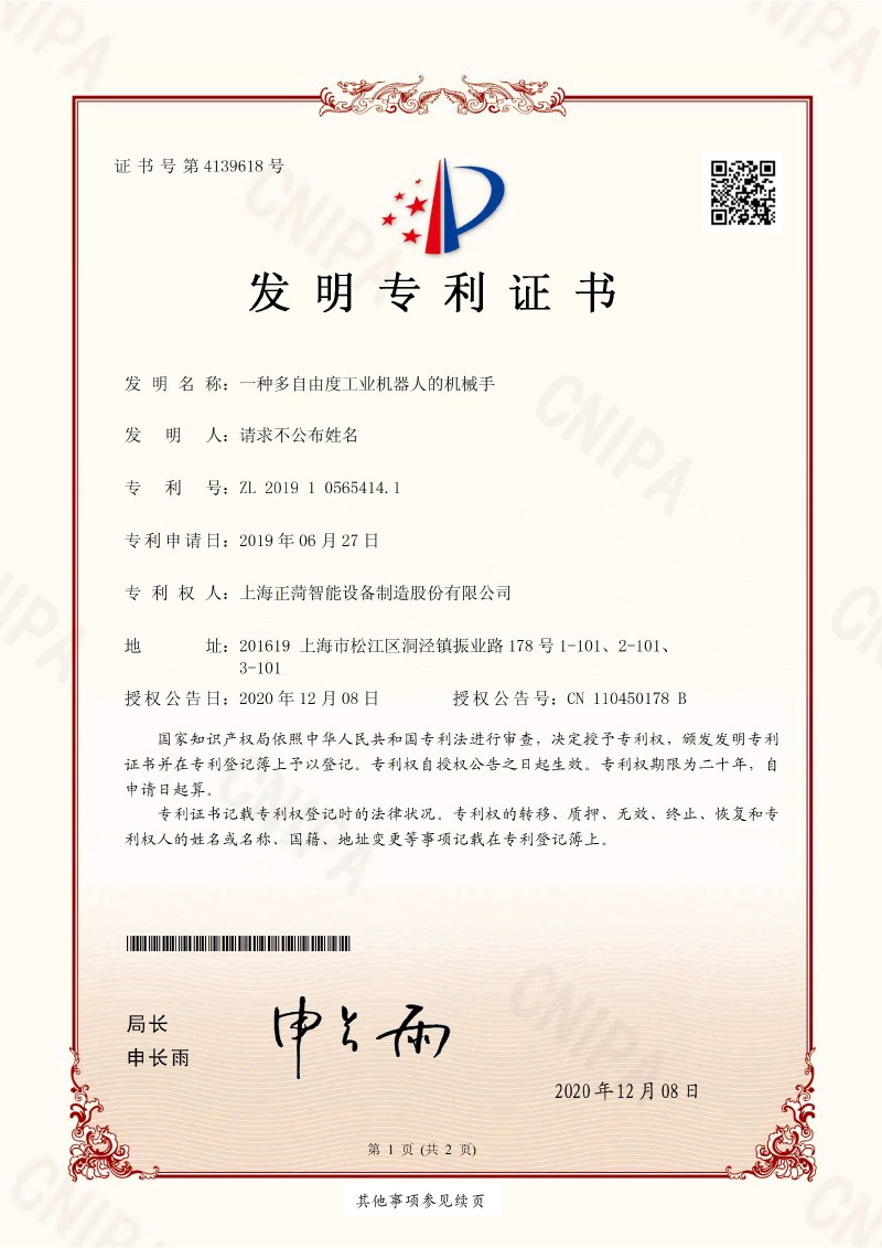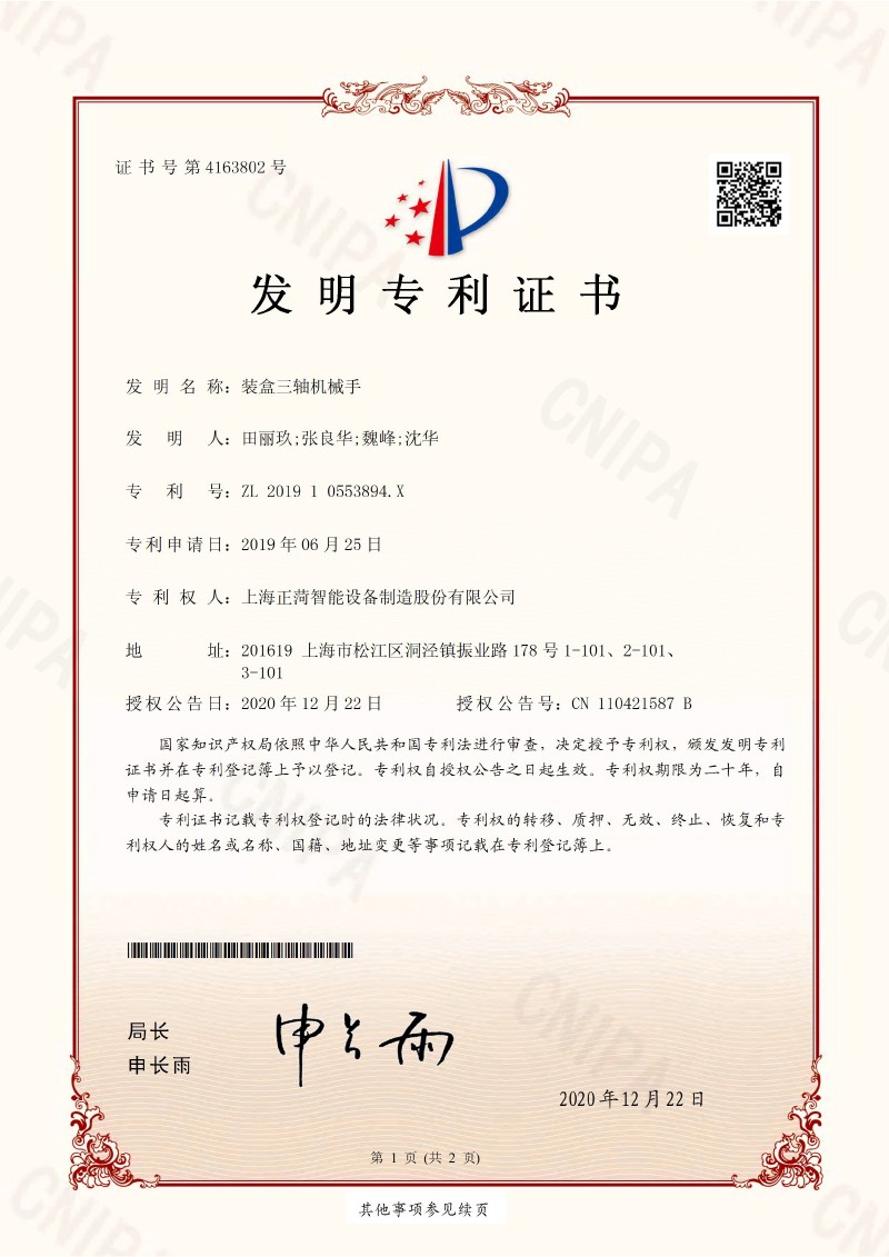 装盒三轴机械手-发明专利证书(...